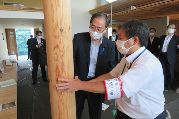 CLT実験棟について説明を受ける斉藤大臣
