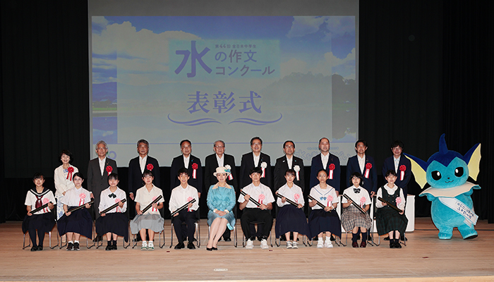 斉藤大臣は、「本日の「水を考えるつどい」が水のもたらす恵みを将来にわたり享受できる社会の構築に向けた一助となりますことを、心より期待しています。」と挨拶し、全日本中学生水の作文コンクールの最優秀賞(内閣総理大臣賞)の受賞者に賞状を授与し、瑶子女王殿下、「水の日」応援大使シャワーズ、受賞者と記念撮影を行いました。