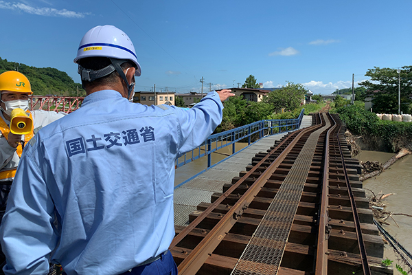 JR五能線の橋梁被災箇所を視察する石井副大臣