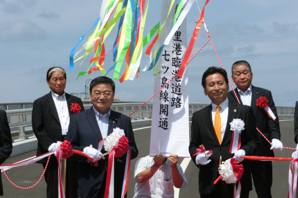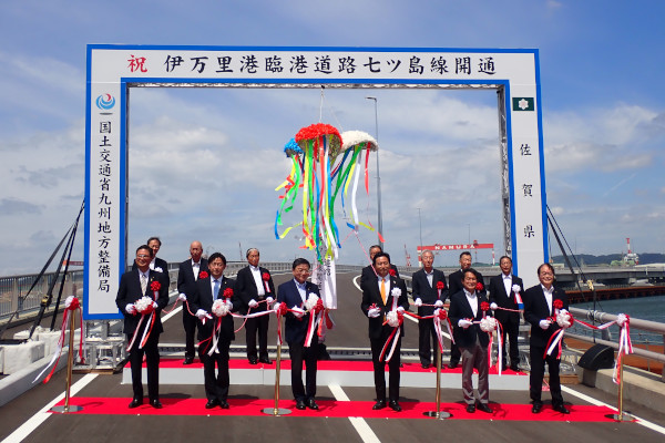 古川政務官は、挨拶のなかで「本事業は、平成26年度より九州地方整備局、佐賀県、伊万里市が一致協力して事業を進め、本日供用を迎えることができました。造船や鉄鋼、バイオマス発電等の企業、コンテナターミナルなどの重要な機能が集積する七ツ島地区が背後各地と高速性・定時性の高い幹線道路ネットワークでつながり、また生活交通との分離が図られることにより、交通渋滞緩和や、九州北西部の物流を広く支える伊万里港の更なる機能強化に繋がります」と述べました。