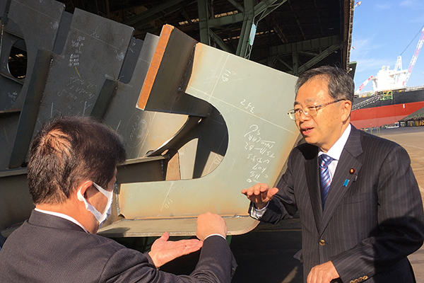 10月29日(土)、斉藤大臣は、造船業における生産性向上の取組状況等を把握するため、今治造船広島工場(広島県三原市)の船舶の建造現場を視察しました。