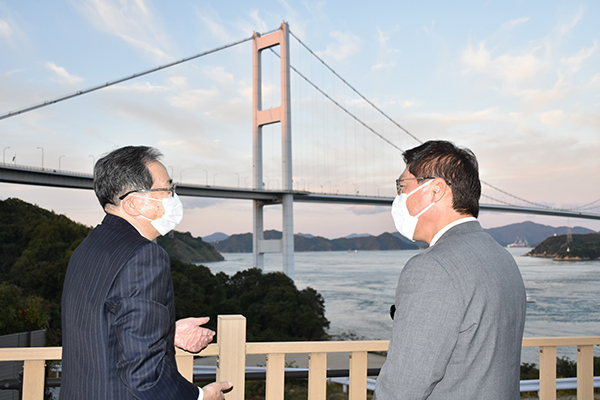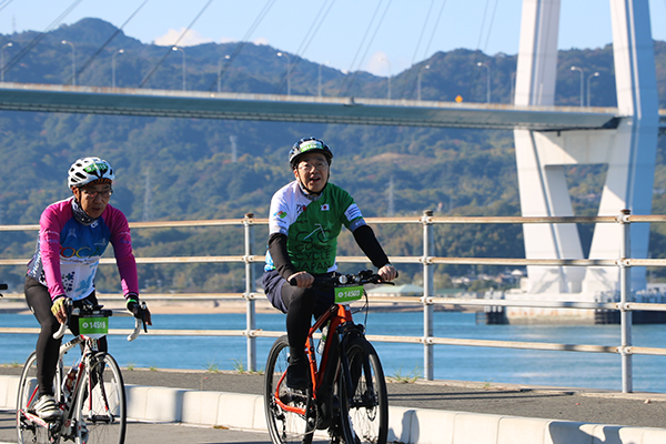 その後、サイクリングを通じた観光振興の取組を確認するため、愛媛県今治市のサンライズ糸山を視察したほか、10月30日(日)には、メインイベントである「サイクリングしまなみ2022」に参加し、しまなみ海道を自転車で走行しました。