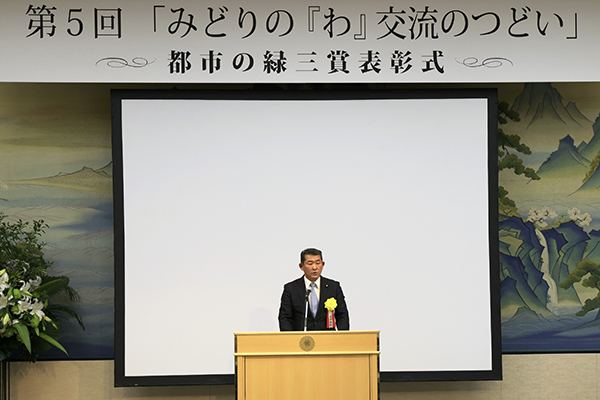 「緑の都市賞」、「緑の環境プラン大賞」、「屋上・壁面緑化技術コンクール」の各受賞者に対し、「皆様の取組は、「みどりの『わ』」を全国に広げていくための原動力となるものであり、その功績に対し深く敬意を表する」と祝辞を述べました。