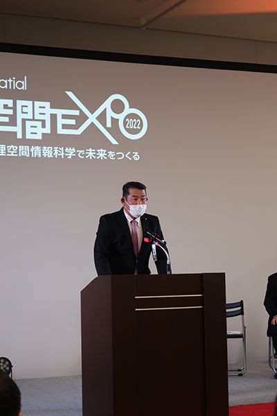 副大臣は、挨拶のなかで、「我が国において、人口減少・少子高齢化や自然災害などの課題が山積している中、地理空間情報を活用した防災・減災への取組や衛星測位サービスの一層の充実などに取り組んでいる。最新の技術やサービスを通じG空間が身近で現実的なものになることが大事なのではないかと考えております。」などと述べました。