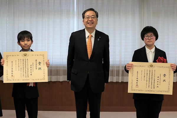 1月12日(木)、「第26回全国児童生徒地図優秀作品展」における大臣賞の表彰式が行われ、斉藤大臣から国土交通大臣賞及び文部科学大臣賞の受賞者に対して、表彰状と盾が授与されました。
