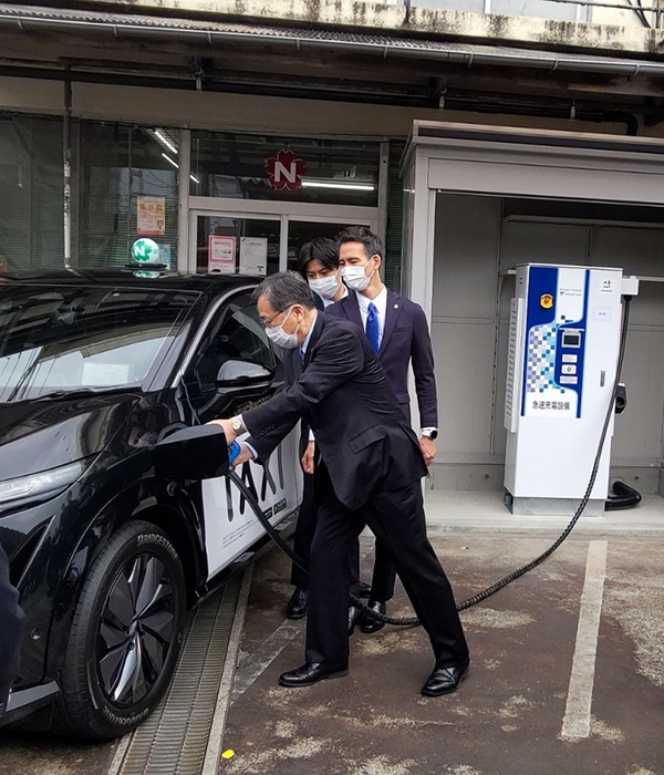急速充電器からEVタクシーへ充電する斉藤大臣