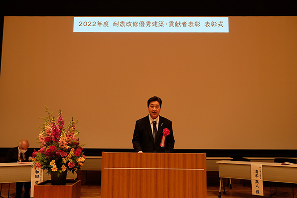 清水政務官は、祝辞の中で「受賞された皆様方には、建築物の耐震性・安全性・さらには機能性の向上の実現に取り組んでいただき、今後とも我が国における建築物の耐震化をリードしていただきますようお願いします。」と述べました。