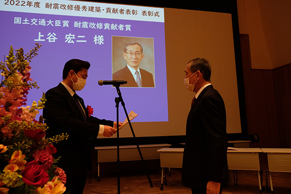 表彰式では国土交通大臣賞・耐震改修優秀建築賞の受賞となりました建築物の(改修事業)関係者、国土交通大臣賞・耐震改修貢献者賞の受賞者に対して表彰状等を授与しました。