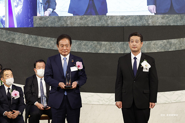 井上社長(左)に表彰状とトロフィーを授与した清水政務官(右)