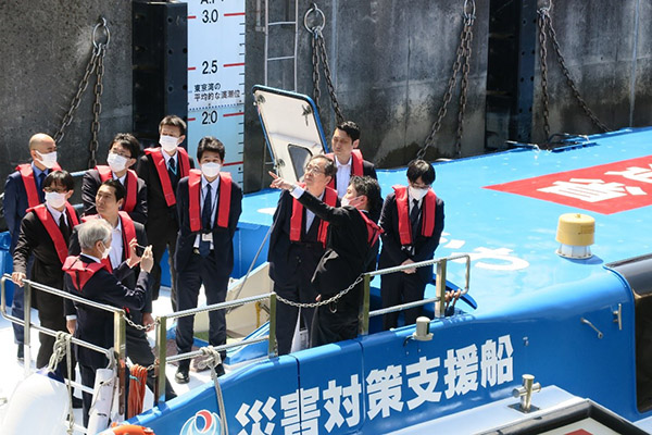 荒川ロックゲート内の船上で職員から説明を受ける斉藤大臣
