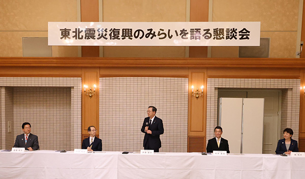 懇談会では、達増岩手県知事、村井宮城県知事、内堀福島県知事、郡仙台市長と、復興インフラの利活用や震災の風化防止・伝承の取組みなど、東北の震災復興のみらいに向けた意見交換を行い、斉藤大臣は結びに、「東北の真の復興を支えるとともに、震災の教訓を全国に広げ、防災力の強化を進めていく」旨、述べました。
