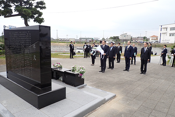 また、懇談会に先立ち、斉藤大臣は、福島県相馬市を訪問し、内堀福島県知事、立谷相馬市長と震災伝承施設、震災復興の現場を視察するとともに、慰霊碑に献花を行いました。
