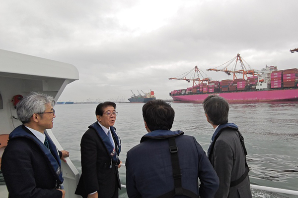 港湾業務艇で名古屋港の説明を受ける金子大臣