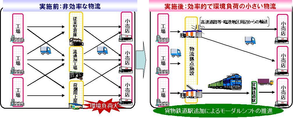 また、環境負荷のさらなる低減に資する物流効率化を図るため、現行の立地要件である高速道路等IC5㎞以内・臨港地区に鉄道貨物駅近傍を追加する。