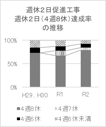 令和2年度は、約8割の工事で週休2日を達成し、前年度より高い達成率となりました。
