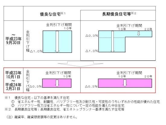 独立行政法人住宅金融支援機構のフラット35S(優良住宅取得支援制度)の金利引下げ幅拡大(当初10年間▲0.3%→▲1%)については、本年12月末までに取扱金融機関が申込を受付けたものを対象としていましたが、想定を上回る多くのご利用を頂いていることから、申込受付期間を3カ月短縮し、平成23年9月30日(金)までとすることとなりました。