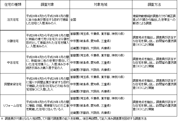本調査は、住宅の種類ごとに以下の調査対象、対象地域、調査方法で行います。