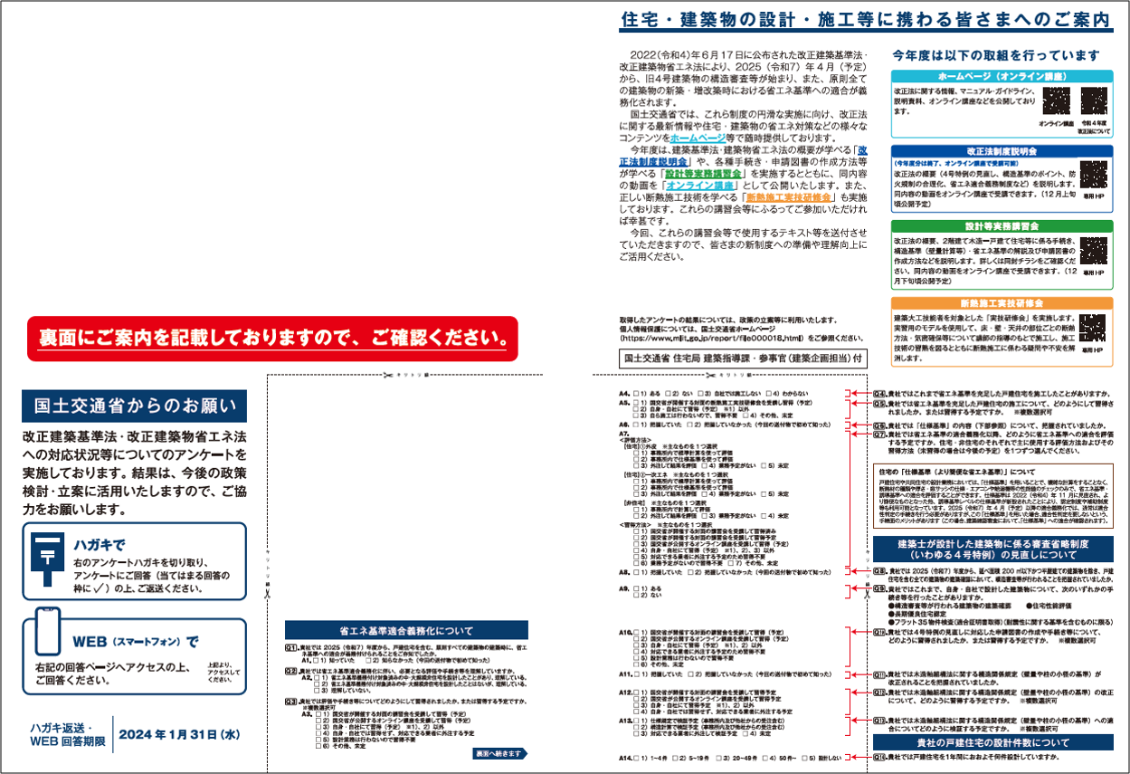 | 2022年6 月17 日に公布された改正建築基準法・改正建築物省エネ法により、2025年4 月(予定)から、旧4号建築物のうち階数2以上又は延べ面積200㎡超の木造一戸建て住宅等の構造審査等が始まり、また、原則全ての建築物の新築・増改築時における省エネ基準への適合が義務化されます。 これら制度の円滑な施行に向け、全国の関係事業者に向け、新制度に対応する手続きや図書の作成方法等に係る実践的なテキスト等を封入したダイレクトメールを発送いたします。改正法制度説明会・設計等実務講習会及びこれらのオンライン講座と併せてご活用ください。 |