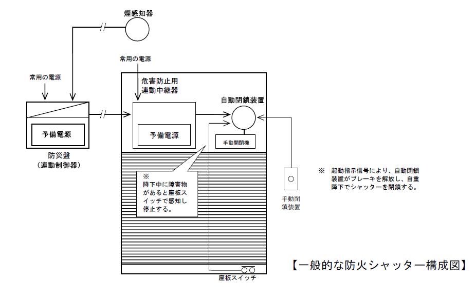 ※1:防火シャッターは、火災による煙や熱を感知して、自動的に閉鎖するものであることが求められている。自動閉鎖装置とは、煙や熱を感知した場合に、連動制御器から、危害防止用連動中継器を通じて起動指示を受けて防火シャッターを自動的に降下させ、また、防火シャッター降下部に障害物が存在した場合に、シャッター最下端部の座板スイッチ信号を受けて、一時的に防火シャッターの降下を停止させる装置のこと。
