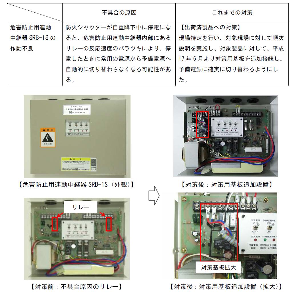 ・文化シヤッター(株)が販売した防火シャッターについて、防火シャッターを構成する部品(自動閉鎖装置ER-A3)(※1)、危害防止用連動中継器SRB-1S(※2))の作動不良により、当該シャッターが降下しない、又は、途中停止する不具合が発生する可能性があることが判明したため、お知らせいたします。
