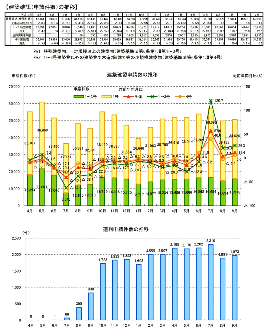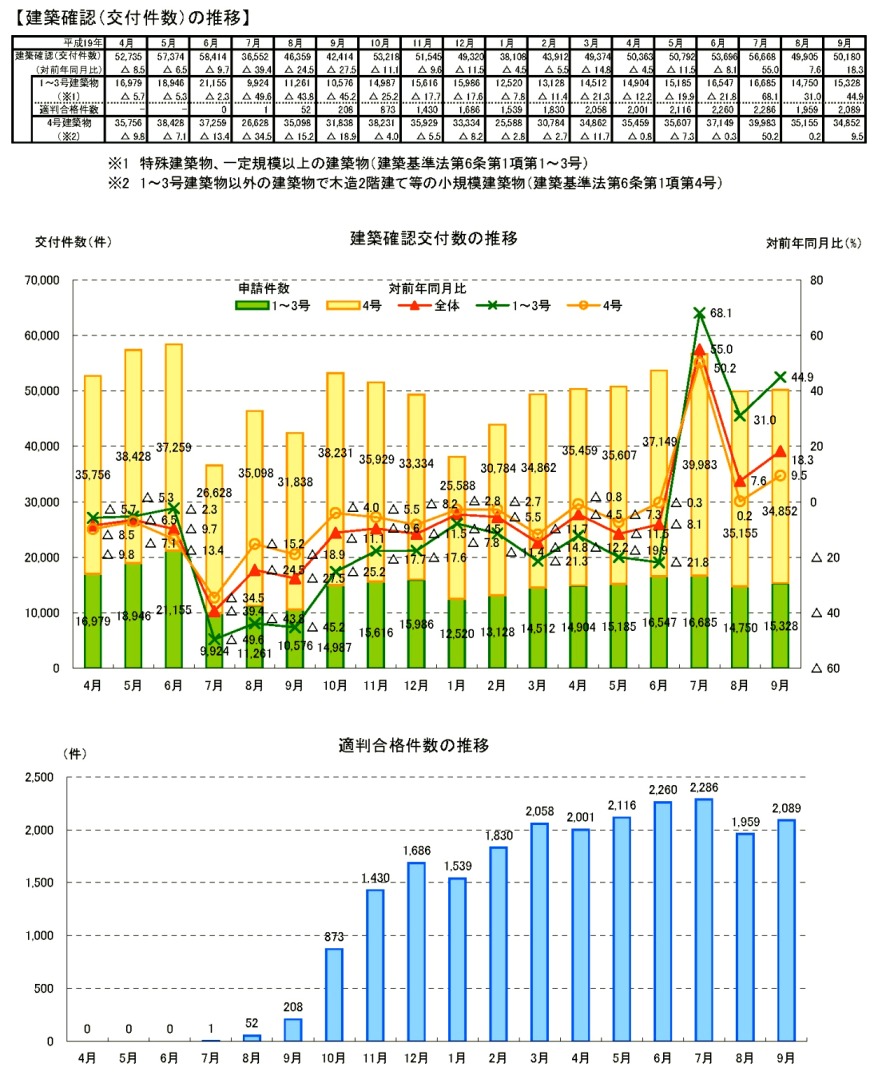 ・9月の建築確認件数は、前月より増加し、対前年同月比は増加。1~3号建築物、4号建築物とも対前年同月比は増加。構造計算適合性判定の合格件数は前月より増加。 ・9月の建築確認申請件数は、前月より増加し、対前年同月比は増加。1~3号建築物、4号建築物とも対前年同月比は増加。構造計算適合性判定の申請件数は前月より増加。