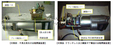 現場特定を行い、対象現場に対して順次説明を実施し、今後、すみやかに、対象となる製品について、クラッチレス及び鋼製ギア構造を採用した自動閉鎖装置に交換する。