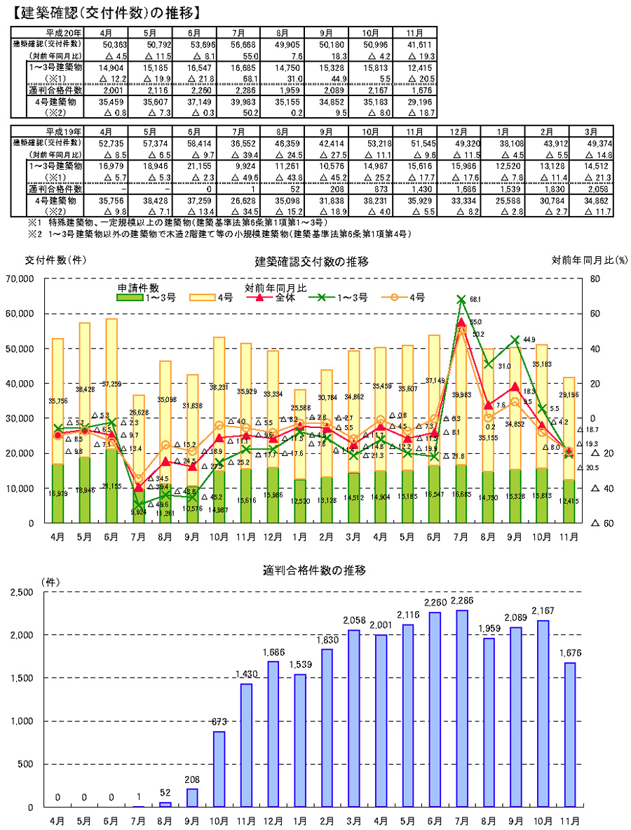 ・11月の建築確認件数は、前月より減少し、対前年同月比は減少。1~3号建築物、4号建築物とも対前年同月比は減少。構造計算適合性判定の合格件数は前月より減少。