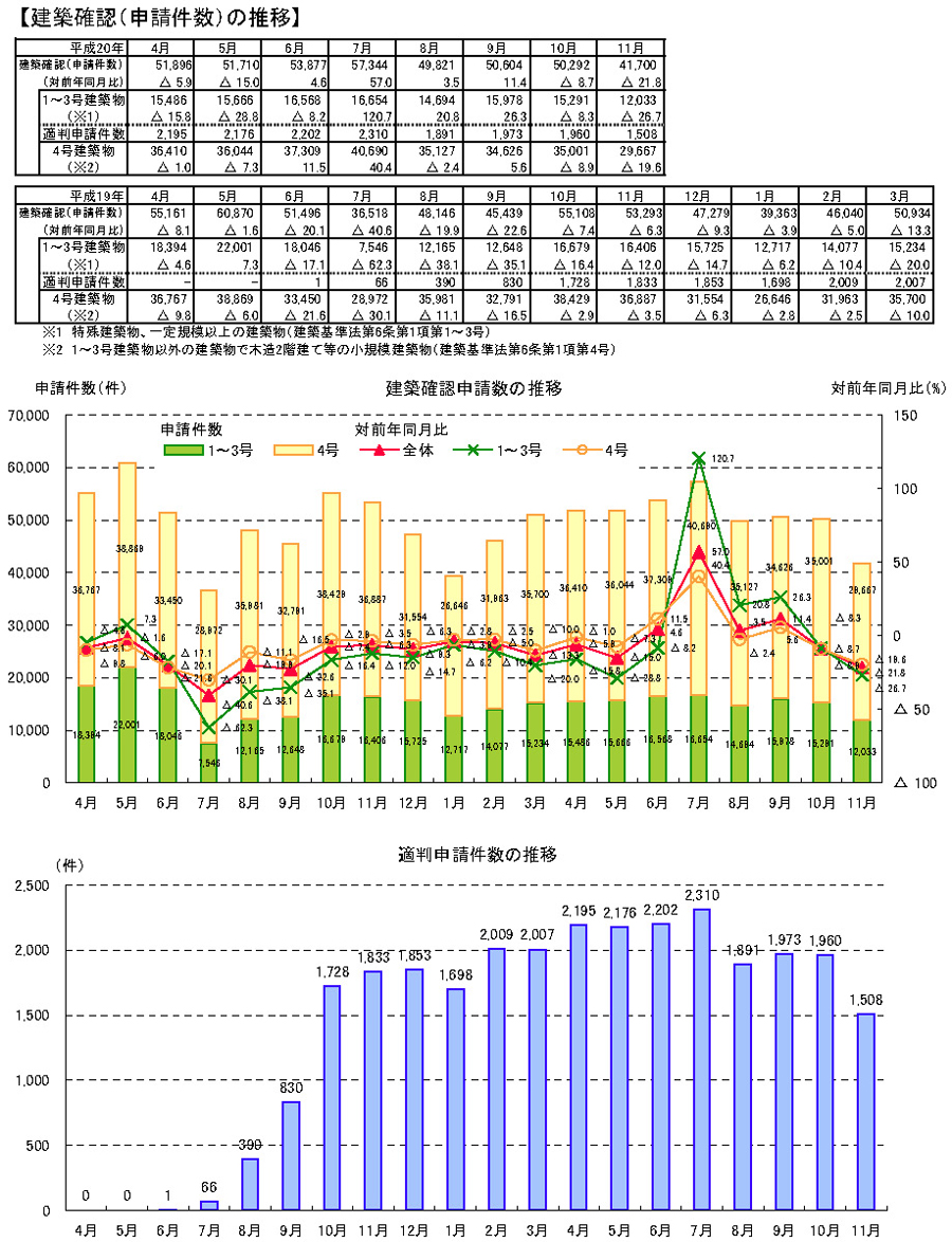 ・11月の建築確認申請件数は、前月より減少し、対前年同月比は減少。1~3号建築物、4号建築物とも対前年同月比は減少。構造計算適合性判定の申請件数は前月より減少。
