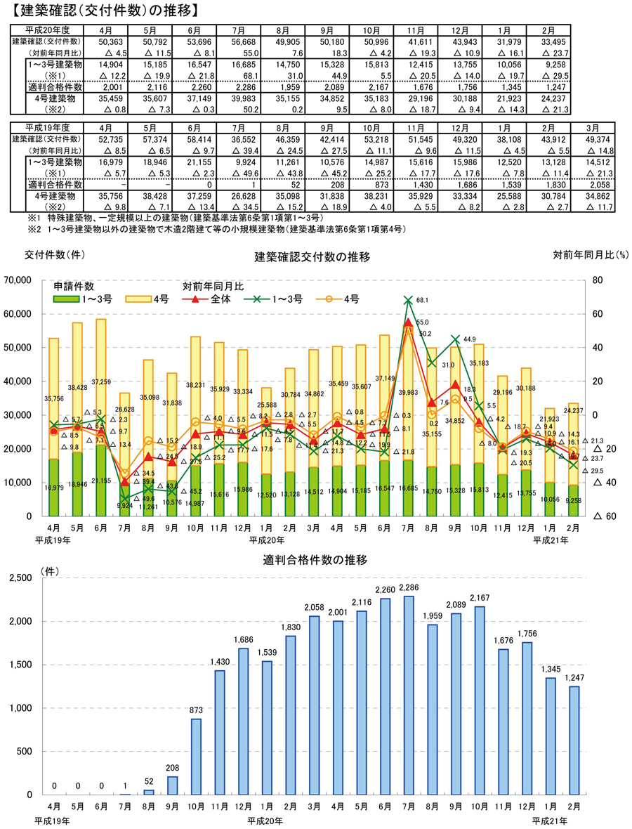 ・2月の建築確認件数は、前月より増加し、対前年同月比は減少。対前年同月比は1~3号建築物、4号建築物とも減少。構造計算適合性判定の合格件数は前月より減少。