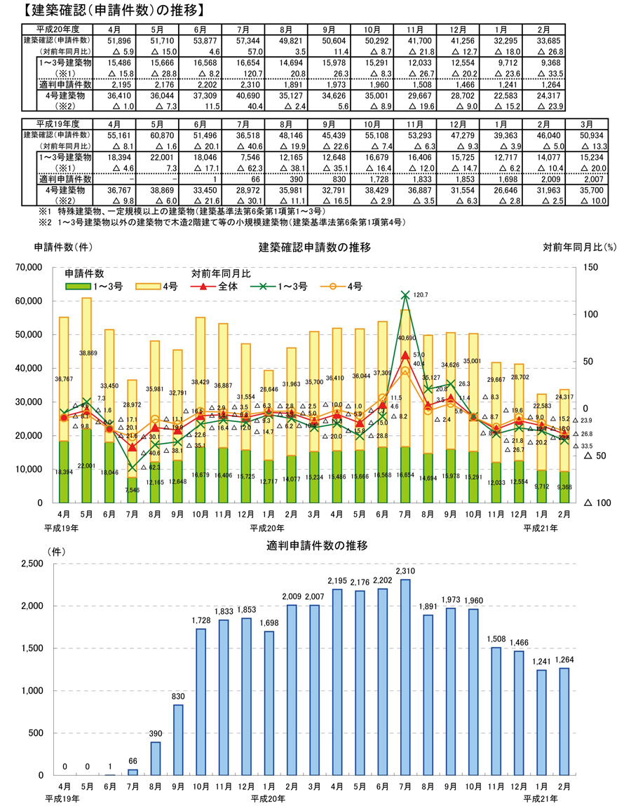 ・2月の建築確認申請件数は、前月より増加し、対前年同月比は減少。1~3号建築物、4号建築物とも対前年同月比は減少。構造計算適合性判定の申請件数は前月より増加。