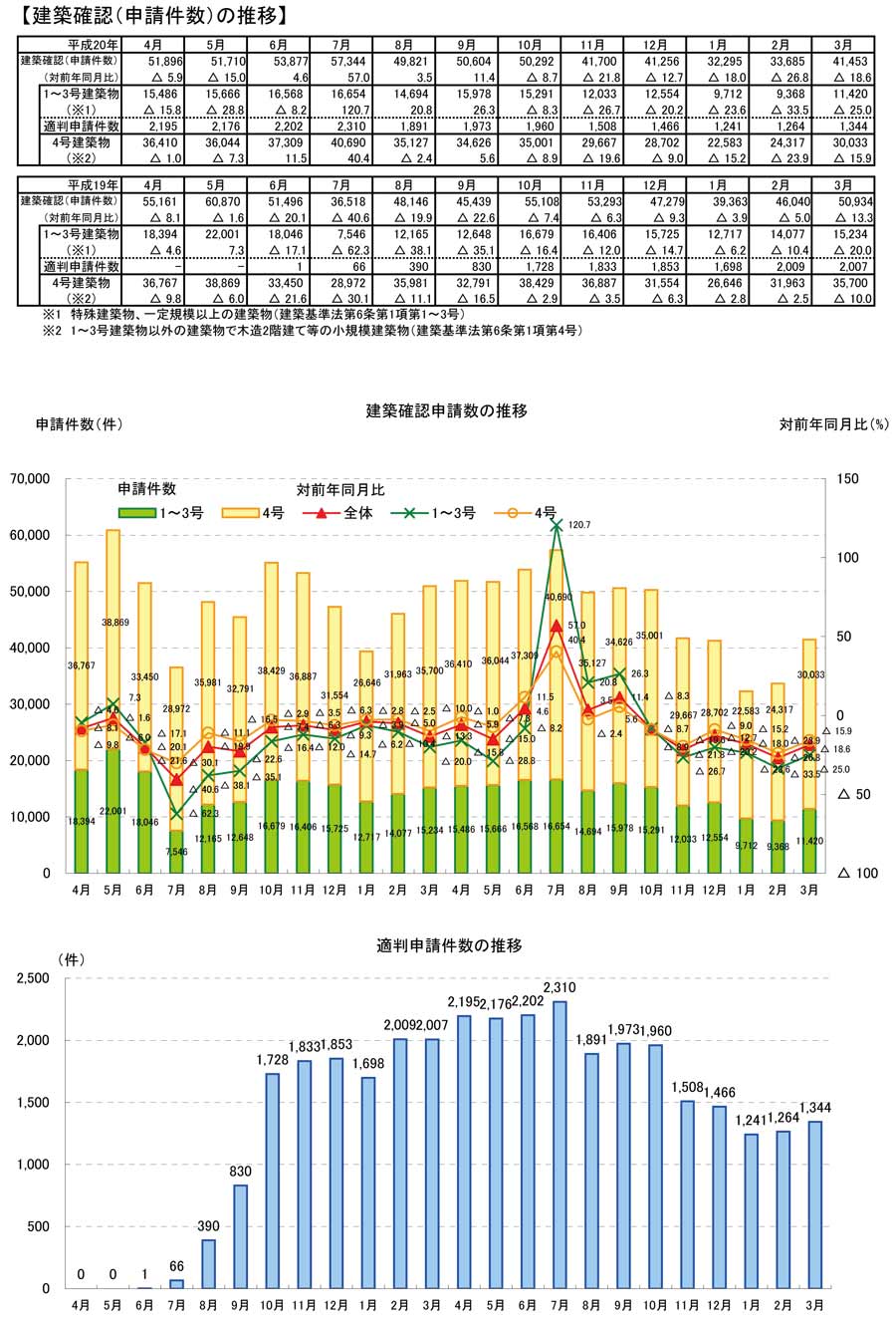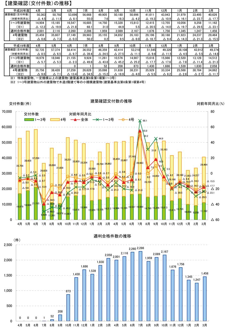・3月の建築確認件数は、前月より増加し、対前年同月比は減少。対前年同月比は1~3号建築物、4号建築物とも減少。構造計算適合性判定の合格件数は前月より増加。