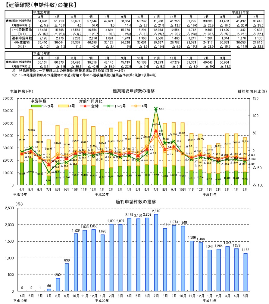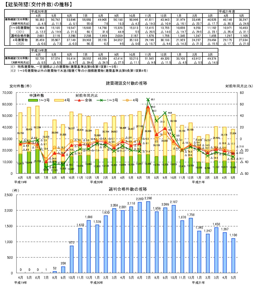 ・5月の建築確認件数は、前月より減少し、対前年同月比は減少。対前年同月比は1~3号建築物、4号建築物とも減少。構造計算適合性判定の合格件数は前月より減少。
