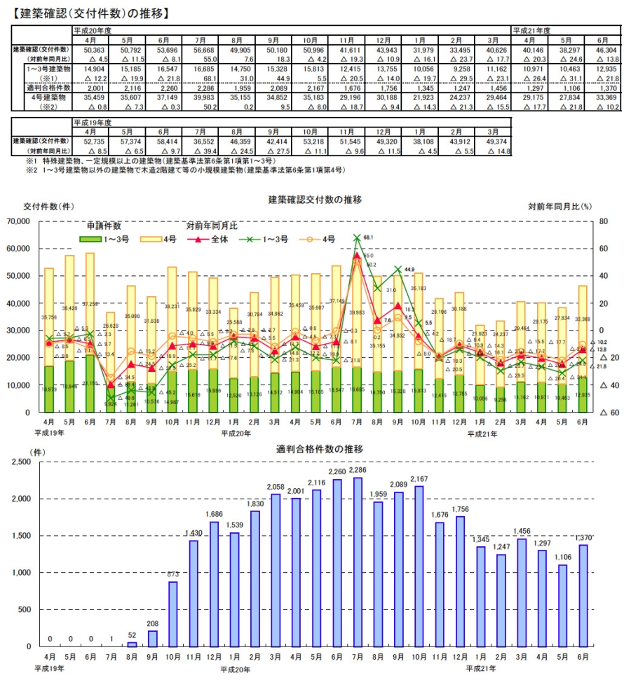 ・6月の建築確認件数は、前月より増加し、対前年同月比は減少。対前年同月比は1~3号建築物、4号建築物とも減少。構造計算適合性判定の合格件数は前月より増加。