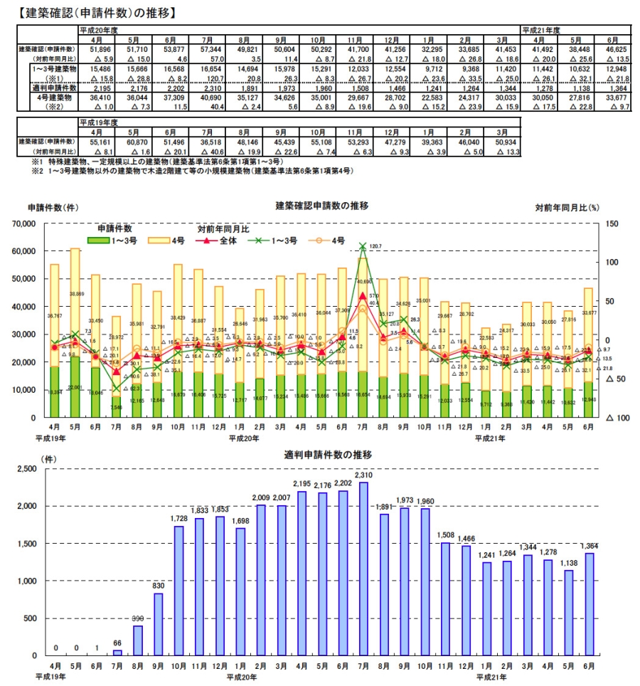 ・6月の建築確認申請件数は、前月より増加し、対前年同月比は減少。1~3号建築物、4号建築物とも対前年同月比は減少。構造計算適合性判定の申請件数は前月より増加。