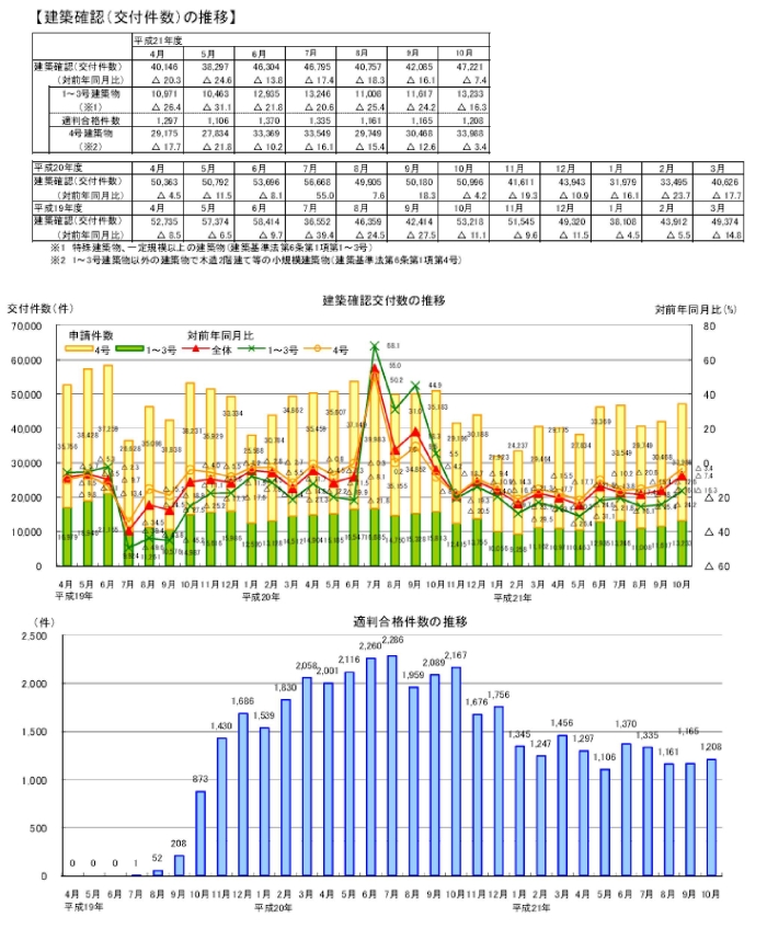 ・10月の建築確認件数は、前月より増加し、対前年同月比は減少。対前年同月比は1~3号建築物、4号建築物とも減少。構造計算適合性判定の合格件数は前月より増加。