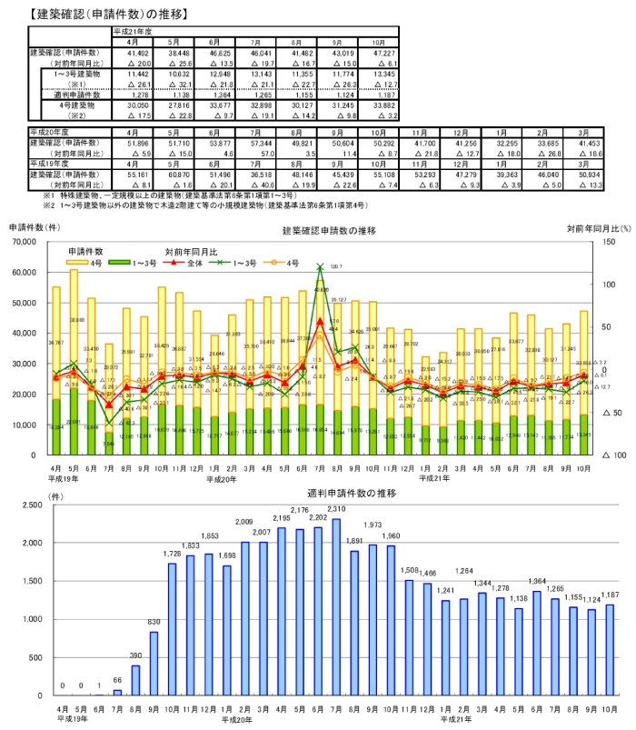 ・10月の建築確認申請件数は、前月より増加し、対前年同月比は減少。1~3号建築物、4号建築物とも対前年同月比は減少。構造計算適合性判定の申請件数は前月より減少。