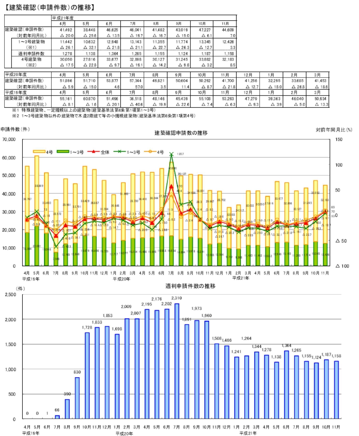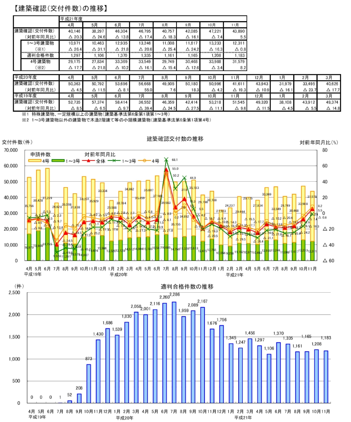 ・11月の建築確認件数は、前月より減少し、対前年同月比は増加。対前年同月比は1~3号建築物は減少、4号建築物は増加。構造計算適合性判定の合格件数は前月より減少。