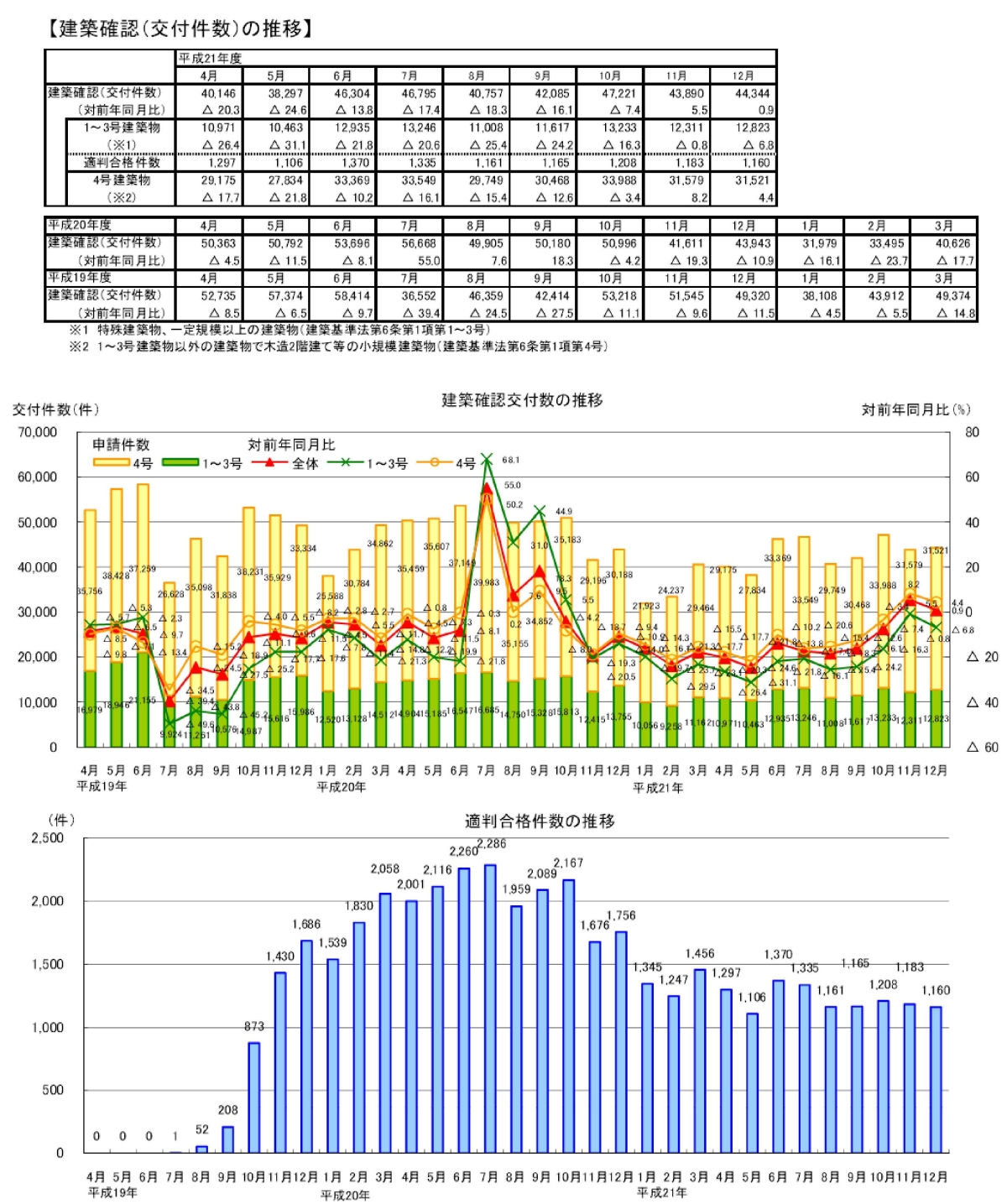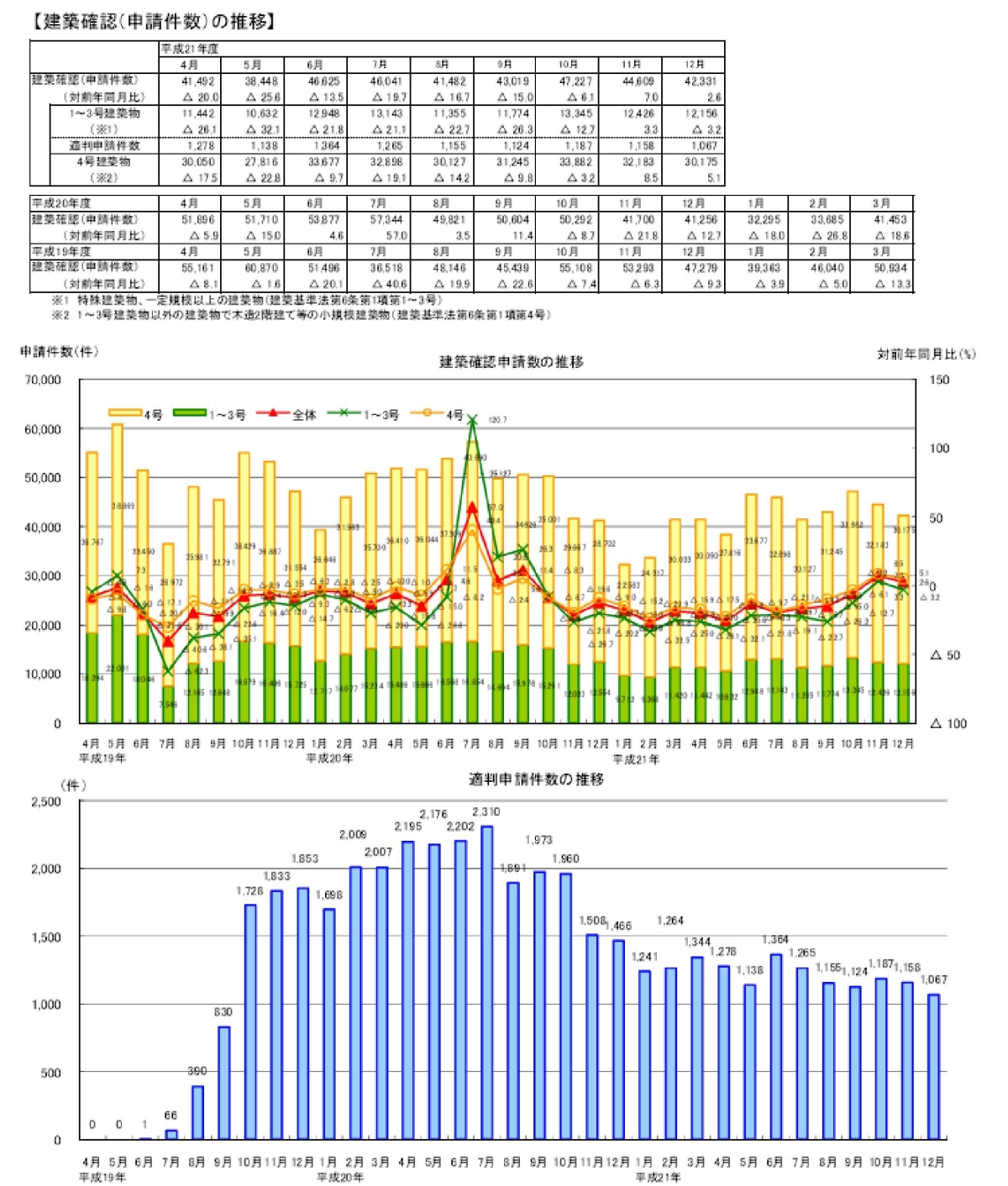 ・12月の建築確認件数は、前月より増加し、対前年同月比は増加。対前年同月比は1~3号建築物は減少、4号建築物は増加。構造計算適合性判定の合格件数は前月より減少。