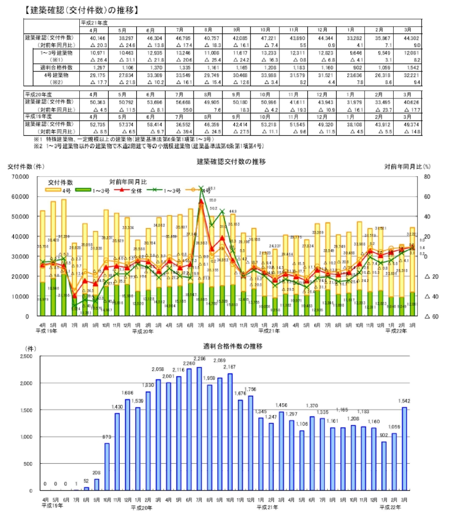 ・3月の建築確認件数は、前月より増加し、対前年同月比は増加。対前年同月比は1~3号建築物、4号建築物ともに増加。構造計算適合性判定の合格件数は前月より増加。