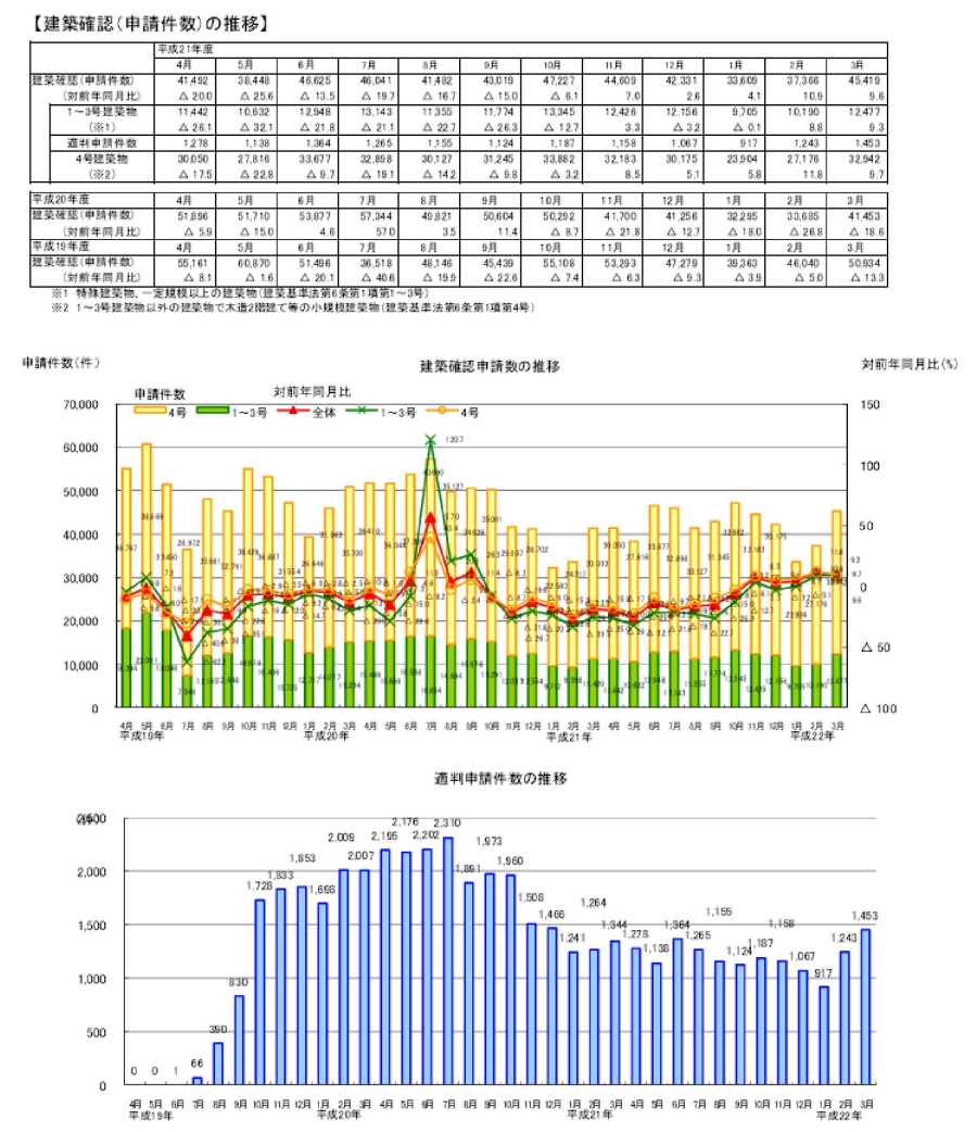・3月の建築確認申請件数は、前月より増加し、対前年同月比は増加。対前年同月比は1~3号建築物、4号建築物ともに増加。構造計算適合性判定の申請件数は前月より増加。