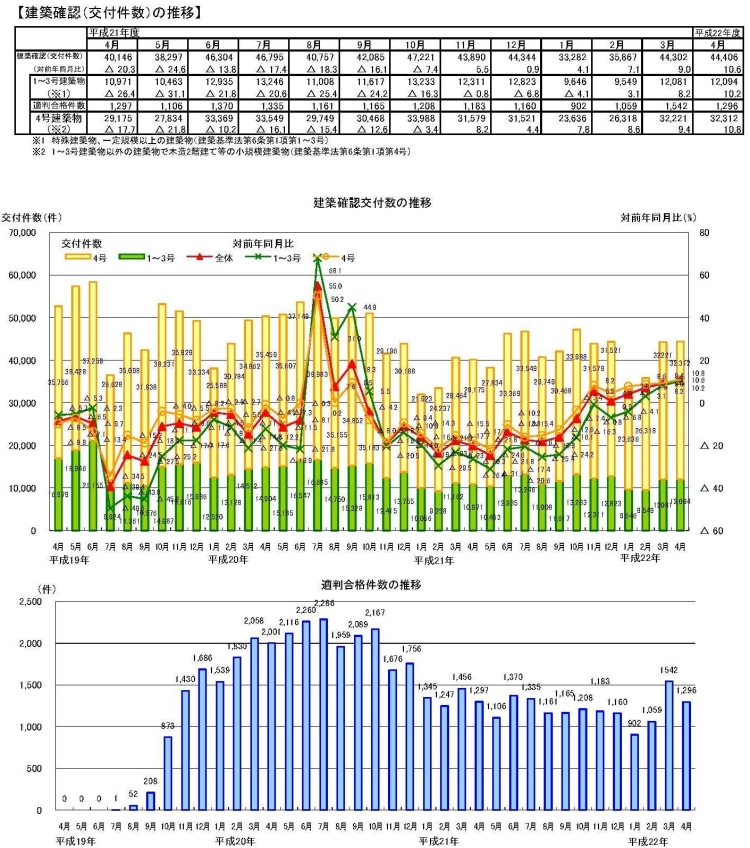 ・4月の建築確認件数は、前月より増加し、対前年同月比は増加。対前年同月比は1~3号建築物、4号建築物ともに増加。構造計算適合性判定の合格件数は前月より減少。