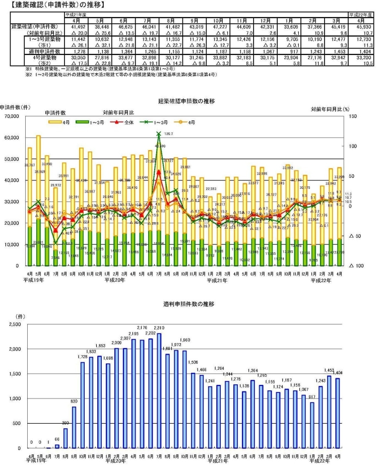 ・4月の建築確認申請件数は、前月より増加し、対前年同月比は増加。対前年同月比は1~3号建築物、4号建築物ともに増加。構造計算適合性判定の申請件数は前月より減少。