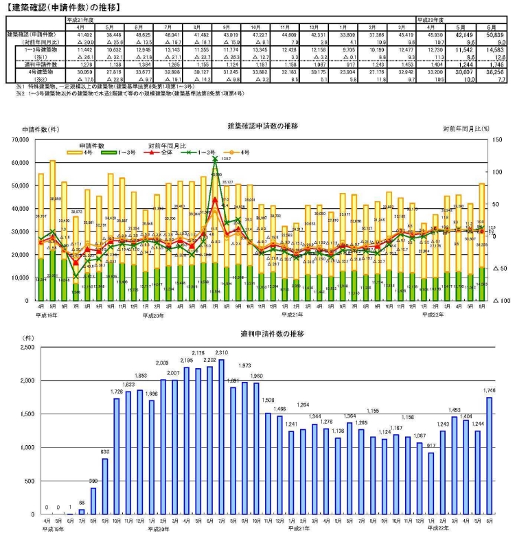 ・6月の建築確認申請件数は、前月より増加し、対前年同月比は増加。対前年同月比は1~3号建築物、4号建築物ともに増加。構造計算適合性判定の申請件数は前月より増加。