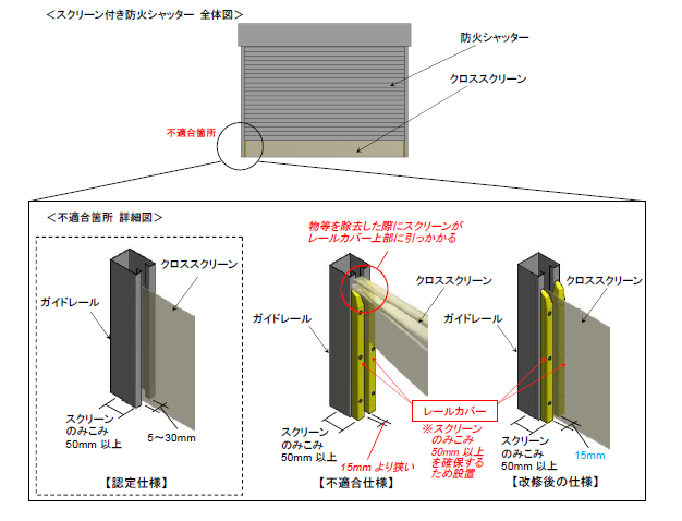 (1) 国土交通省は、三和シヤッター工業(株)が既設の防火シャッターの下部に設置したクロススクリーン※1について、防火シャッター閉鎖時に物等が挟まった場合、これを除去した後に、クロススクリーンがレールカバー上部に引っ掛かり、クロススクリーンが再降下しないものがあるとの情報提供を受け、三和シヤッター工業(株)に対し事実関係を確認したところ、以下のとおり報告がありました。