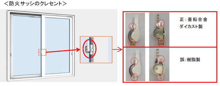 ・ 不適合は、防火サッシのクレセントの一部が、認定仕様は「亜鉛合金ダイカスト製」であるところを「樹脂製」としたものであること(下図参照)