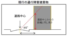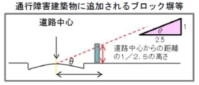 通行障害建築物に、その前面道路に面する部分の長さが25m※3を超え、かつ、その前面道路に面する部分のいずれかの高さが、当該部分から当該前面道路の境界線までの水平距離に当該前面道路の幅員の2分の1に相当する距離※4を加えた数値を2.5で除して得た数値を超えるブロック塀等であって、建物に附属するものを追加します。
