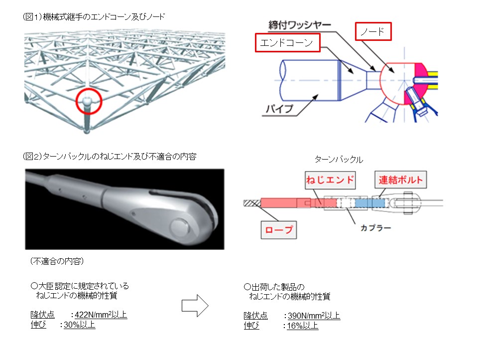 ・同社が製造し体育館等に出荷した機械式継手※1及びターンバックル※2が、国土交通大臣認定※3(以下「大臣認定」という。)の仕様に適合しない仕様となっていること。