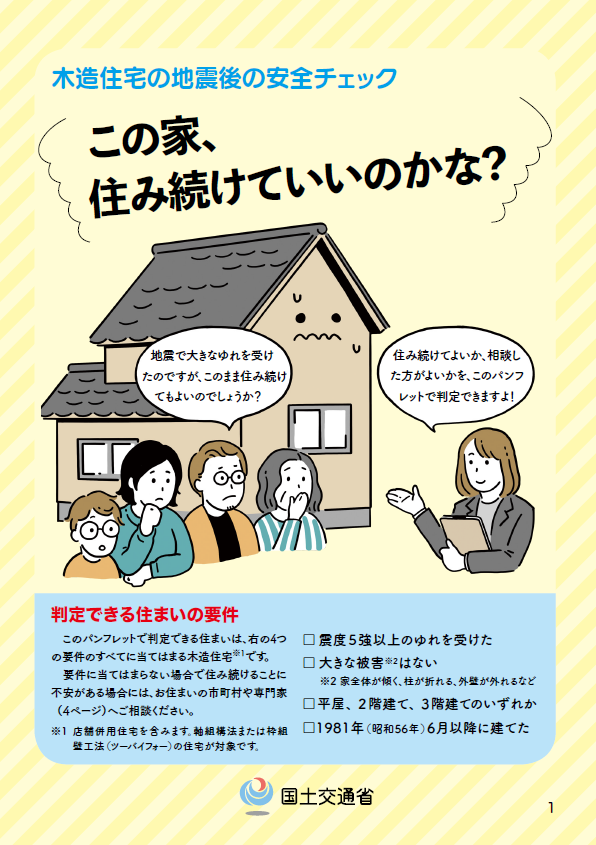 | 地震で大きなゆれのあった地域の住宅は、損傷により構造耐力が低下している可能性があります。 このため、木造戸建て住宅について、居住者がご自身で住宅の状況をチェックのうえ、そのまま住み続けてよいか、専門家に相談した方がよいかを判定する方法を整理し、パンフレットを作成しました。 令和6年能登半島地震を含め、地震で大きなゆれのあった地域にお住まいの方に活用いただけるよう、広く周知してまいります。 |