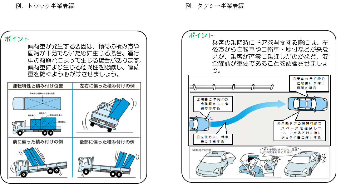 トラック、バス、タクシーの各業態別に安全運転のためのわかりやすい教育用マニュアルを策定しました。