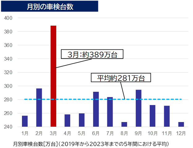 ※に受検いただいていますが、車検需要が年度末に集中しているため、この時期は、自動車ユーザーが整備や車検の予約が取りづらく、自動車整備士も残業・休日出勤に追われるという問題が生じています。